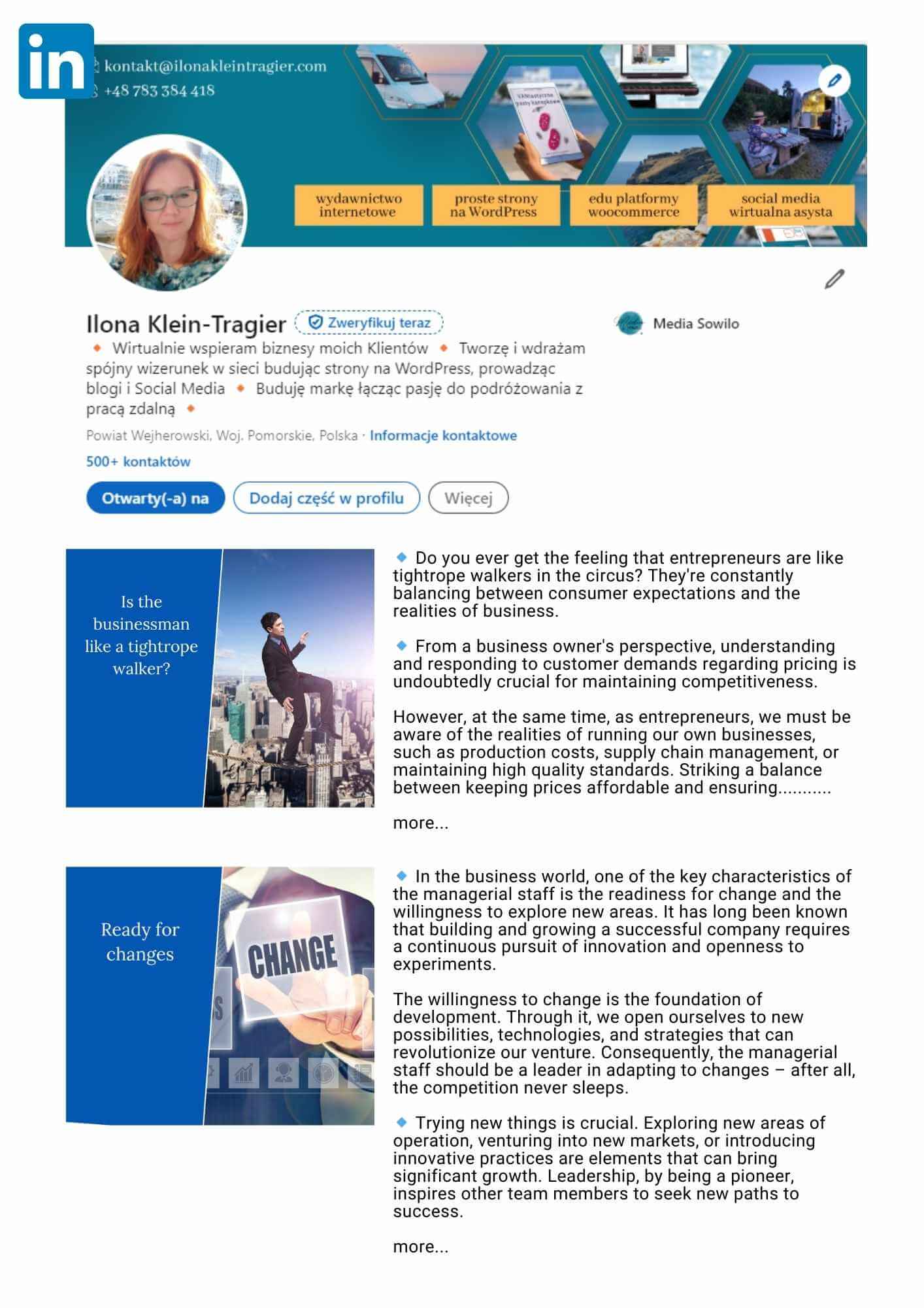 Tworzenie PIĘKNYCH stron internetowych to nie praca dla informatyka, tylko dla ARTYSTY z odpowiednim przygotowaniem od strony informatyki. To wymaga gustu, poczucia piękna i estetyki, umiejętności aby dobrać i spiąć kolory, zdjęcia, inne elementy graficzne, hasła, moduły… ILONA jest właśnie artystą. Ona intuicyjnie czuje jakiego rodzaju piękna szukasz i gdy go przełoży na WordPress, poprowadzi Cię za rączkę przez wszystkie jego zawiłości, funkcjonalności, szablony, wtyczki, rozwiązania. Podejmie się każdego wyzwania i pytania, i odkopię odpowiedź jeśli nie będzie jej znała. Jest po ludzku wyrozumiała, konstruktywna, pomocna, optymistyczna. Polecam z całego serca.